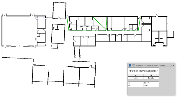In den meisten Entwürfen können Sie ermitteln, welche Räume hinsichtlich der maximalen Wegstrecke ausgewertet werden müssen. Verwenden Sie die Routen-Analysewerkzeuge, um die tatsächliche Wegstrecke zu ermitteln. Im Videobeispiel werden zwei Bewegungspfadlinien zu den am weitesten entfernten Ecken des Raums hinzugefügt, die am weitesten vom Ausgang entfernt liegen. Eine Bauteilliste wird verwendet, um die Länge der Bewegungslinien aufzuführen. In der Bauteilliste wird der Pfad A als maximaler Abstand zum nächstgelegenen Ausgang angegeben.