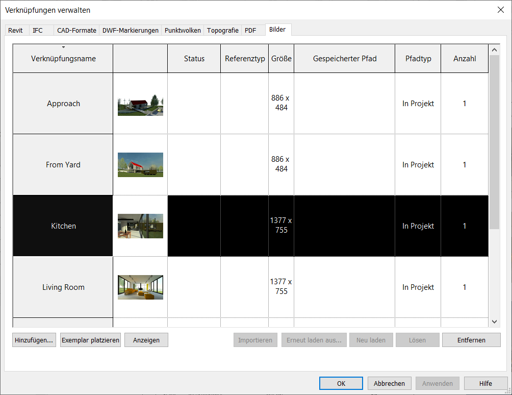 Sie können auch das Werkzeug Verknüpfungen verwalten verwenden, um vorhandene Verknüpfungen und Bilder im Revit-Projekt hochzuladen und zu ersetzen. Durch Ihre Änderungen im Werkzeug Verknüpfungen verwalten werden Bilder und Dateien in allen Revit-Dateien Ihrer Teamkollegen aktualisiert.