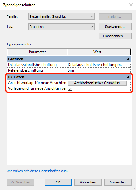 Ansichtsvorlagen steuern viele Aspekte der Darstellung einer Ansicht. Andere Aspekte wie Maßstab, Schatten oder Phasenstatus können als Teil einer Ansichtsvorlage enthalten sein. Alle Eigenschaften einer Ansicht, die mithilfe einer Ansichtsvorlage gesteuert wird, werden auf der rechten Seite des Dialogfelds Ansichtseigenschaften angezeigt. Achten Sie beim Erstellen von Ansichtsvorlagen darauf, alle Aspekte der Ansicht zu prüfen, die gesteuert werden sollen, damit Sie Ihre Ansichtsvorlagen optimal nutzen können.