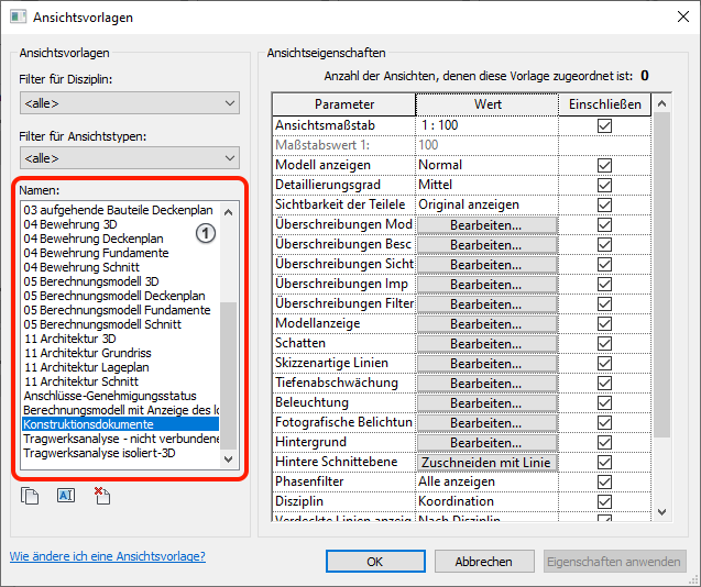 Verwenden Sie Ansichtsvorlagen, um die Sichtbarkeits- und grafischen Überschreibungen schneller und konsistenter auf Ihre Ansichten anzuwenden. Revit