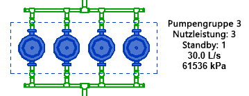 Wenn Sie einen HLS-Bauteilsatz erstellen, können Sie die Anzahl der eingesetzten und der Pumpen auf Standby festlegen. Diese Informationen werden bei Volumenstrom- und Druckverlustberechnungen für die richtige Dimensionierung der Abzweige und Endstücke der Pumpengruppe verwendet.