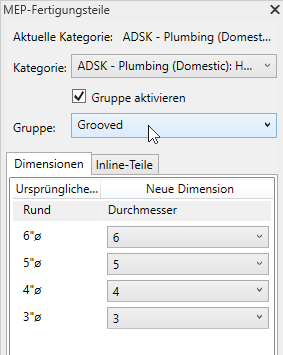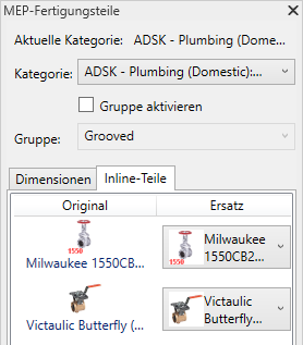 - Geben Sie auf der Registerkarte Inline-Teile nach Bedarf Zuordnungen für neue Formteile an, meist Ventile und Klappen.