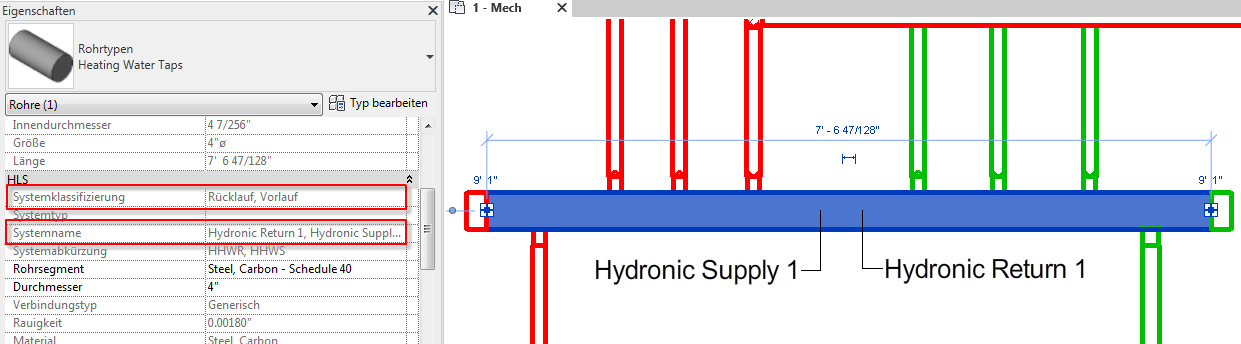 Wenn die Sekundärkreisläufe über Gewindeanschlüsse mit dem Endstück verbunden sind, enthält das Endstück sowohl Versorgungs- als auch Rückführungssysteme des Primärkreislaufs. Diese Systeme werden in der Mitte des Rohrs geteilt, wie unten abgebildet. Beachten Sie, dass beide Systemnamen und -klassifizierungen in der Eigenschaftenpalette angezeigt werden.
