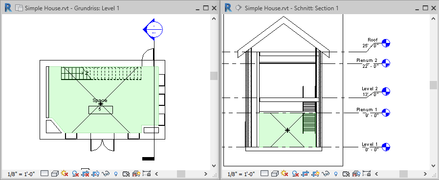 - Schließen Sie alle Ansichten mit Ausnahme der Schnittansicht und der Grundrissansicht, in der Sie den Raum platzieren möchten, und geben Sie auf der Tastatur w t ein, um die beiden Ansichten nebeneinander anzuzeigen.