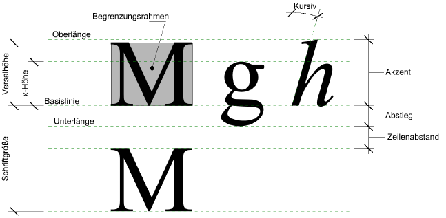 Zur Angabe der Textgröße wird jetzt stattdessen die Versalhöhe verwendet, die von der Basislinie zum oberen Ende des Großbuchstabens "M" gemessen wird. Beachten Sie, dass viele asiatische Schriftzeichen etwas höher sind als der Großbuchstabe "M" und deshalb höher als der für den Parameter Textgröße angegebene Wert für westliche Schriftarten dargestellt werden. Passen Sie den Parameter Textgröße an, um die gewünschte Höhe für diese Zeichen zu erzielen.