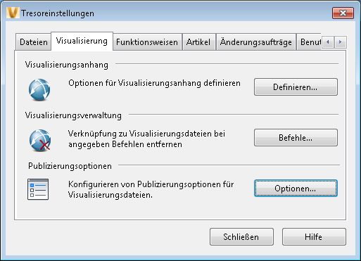 Konfigurieren von Visualisierungsanhängen, Verwalten von Visualisierungsdateien und Konfigurieren von Publizierungseinstellungen auf der Registerkarte Visualisierung des Dialogfelds Tresoreinstellungen.