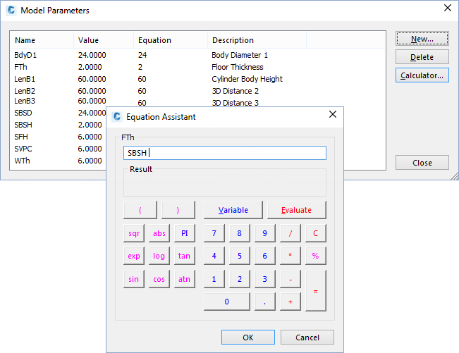 - Double-click the Equation column value for a model parameter (such as LenB1), and you can enter a value or an equation to specify the length of the part.