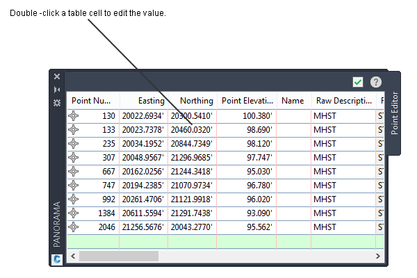 Some object types, such as alignments and profiles, use the Panorama window to display a table of elements that make up that object.