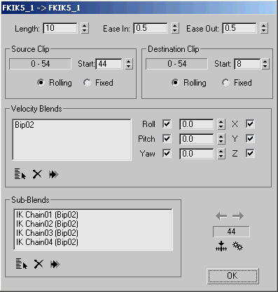 A Velocity Blend object is one that has its positions blended based on velocity (like a biped's COM). Objects used for Velocity Blending are most commonly the roots of the mix hierarchy. When you pick an object for velocity blending, its animation will accumulate based on its trajectory in the scene; for example, choosing the root of a character as the blend object will ensure that the character’s animation is transitioned relatively from clip to clip, so the character keeps moving through world space instead of repeating each clip as absolute. All children of the root will follow in the transition.
