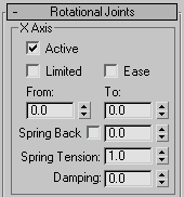 The Sliding Joints rollout and Rotational Joints rollout contain similar controls for position and rotation, respectively. Also, each rollout contains identical group boxes for control of the X, Y, and Z axes.