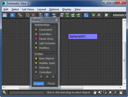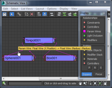 If parameters are wired within a scene node, such as an object's position to a parameter of a modifier applied to the object, the wiring might not be readily apparent in Schematic View. However, you can use additional Display options to expose the wiring.