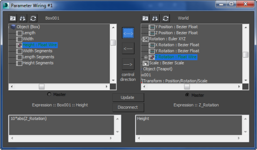 The Disconnect button is enabled when you’ve selected parameters with an existing wire between them. It will remove the wire controller(s) and replace them with the Master parameter’s animation track (if two-way) or with default controllers (if one-way).
