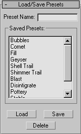 Contains all the saved preset names. A number of presets are included with 3ds Max; to see what they do, create a particle system, load a preset, and play back the animation. Some of the presets, such as Particle Array's Shimmer Trail, are most effective with moving particle systems.