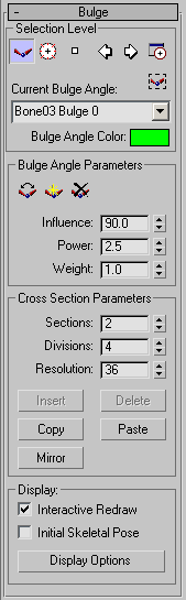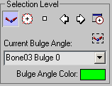 - Changes the angle value to the skeleton’s current joint angle on the current bulge angle (visible in the Current Bulge Angle field in the Selection Level group). First use Move or Rotate in a viewport to change the angle between the selected link and its child, then click Set Bulge Angle.