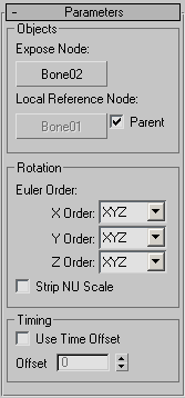 The Expose Transform helper exposes values of non-keyed objects for use in expressions and scripts. This lets riggers and animators access a select set of transforms for an object, and between an object and its parent, such as a bone in an IK chain. For example, using the Expose Transform helper, you could write a script or use parameter wiring that tests the angle of an character's arm bone that's controlled by IK (thus, has no keys), and once it exceeds a specific value, rotate the corresponding clavicle bone to deform the shoulder area.