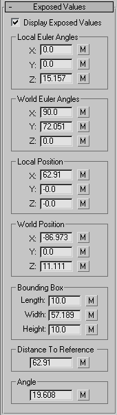 This rollout provides readouts of values for all transform values of the Expose Node object. Each value has a button labeled “M” next to it; click this button to copy the MAXScript associated with the value to the clipboard, which you can then paste into a script.