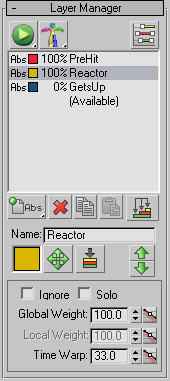 You can move and rotate the transform gizmo to change the position and direction of an animation clip. It appears as if the character is linked to the transform gizmo, but it is not. In fact, each layer has its own transform gizmo. The transform gizmo’s main purpose is to allow you to reuse animations by moving and rotating them in space.