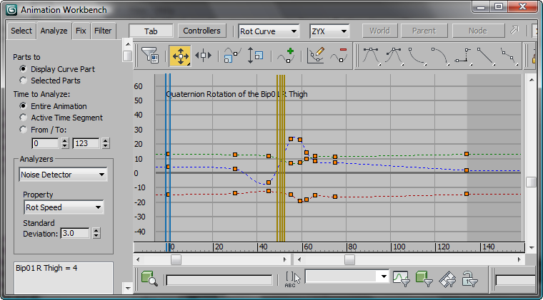 These are used to find out-of-the ordinary properties in your animation. Certain analyzers parse the waveform of your motion tracks and detect variation from the curves. There are two detectors available that do this; Noise and Spike. There are also analyzers for finding and fixing knee conditions, specifically knee wobble and extension.