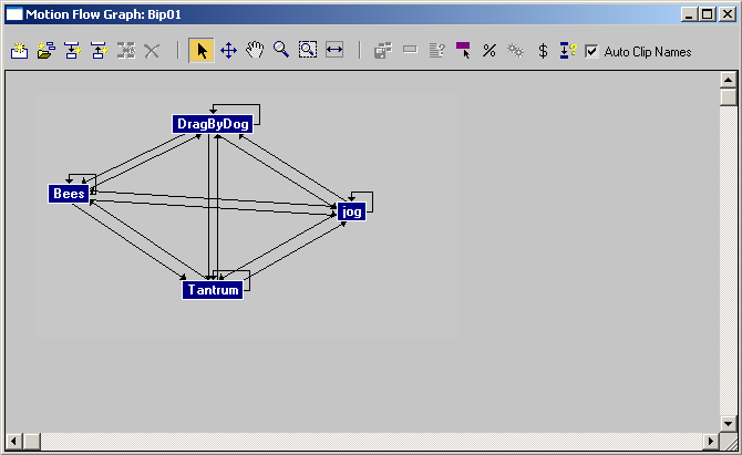 You create random motion by first adding clips to the Motion Flow Graph and adding transitions between the clips. Clips and transitions are then given percentages, which are used to create random motion for one or more bipeds. You can manually control the “weighting” for a possible start clip, transitions, and frame range. This allows you to animate multiple bipeds in a crowd scene for example. A different script is created for each biped.