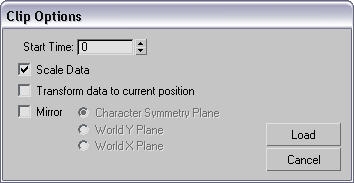 Lists clips saved in the default location. To apply a clip to the selected rig, double-click its list entry. This opens the Clip Options dialog.