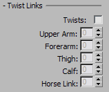 The bone twist option includes all limbs. These settings allow better mesh deformation on skinned models (using Physique or Skin) when twisting occurs on animated limbs. Use the Twist Poses rollout for better control over your twist links.