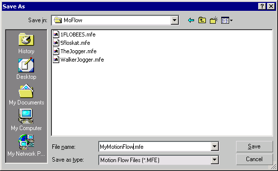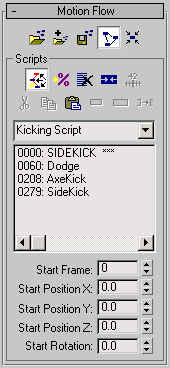 Scripts, transitions, and clip references are saved in a Motion Flow Editor MFE, file, for later editing. This format lets you save a Motion Flow and script from one biped and load it onto another biped.