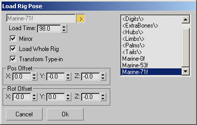 Lets you apply a transformation to the loaded pose. Use the Pos(ition) and Rot(ation) Offset fields to enter values for the transformation of the pose data from the saved version. You can, for example, ensure that the pose is loaded in its exact original location for creating looped motions, or with a specific translation and rotation offset.