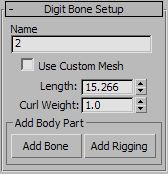 Access the Digit Setup rollout by selecting a digit bone in the viewport. These settings affect the entire digit to which the bone belongs.