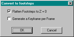 When you click Convert on the Biped rollout of the Motion panel, a Convert To dialog displays: Convert to Freeform or Convert to Footsteps, depending on the animation method of the currently loaded motion.