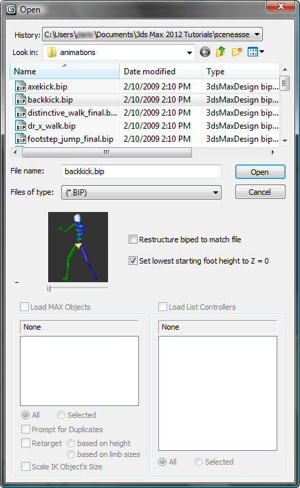 When you load a FIG file (in Figure mode), the Open dialog is a standard Windows Open File dialog. However, when you load a BIP or STP file, you can preview the animation and control how much information is loaded into your biped.