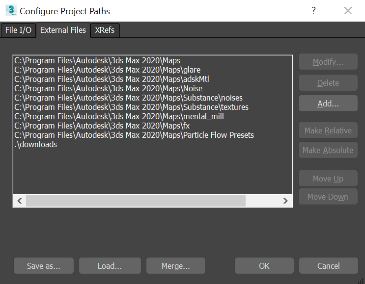 You can use MXP (Max Path) files to save, load, and merge the paths that the Configure Project Paths dialog manages. This capability makes it easy for content-creation teams to keep projects organized and work efficiently by using the same paths.
