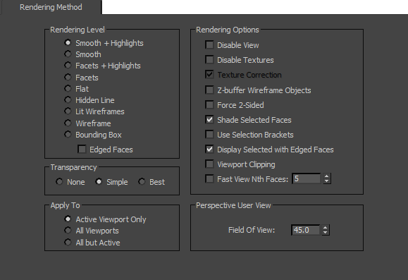 For legacy display drivers (Direct3D and OpenGL), the Rendering Method panel of the Viewport Configuration dialog sets the rendering method for either the current viewport or all viewports.