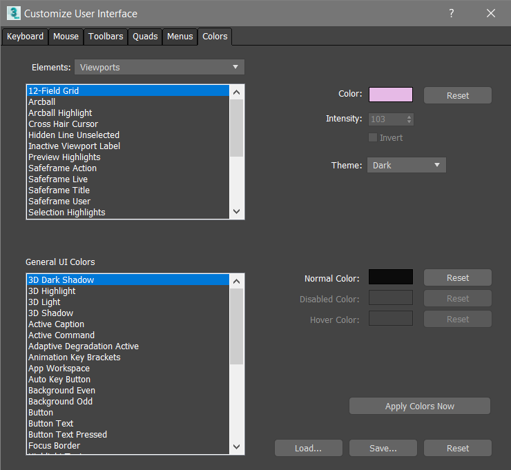 - Open the Customize User Interface dialog to the Colors panel.