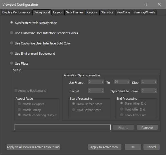 1. On the Viewport Configuration dialog Background panel, choose Use Files.