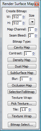 This dialog provides a set of tools for creating bitmaps based on an object’s UVW mapping. The bitmaps display certain surface properties of the object. There’s also a Bitmap Select function for selecting sub-objects based on mapping attributes.