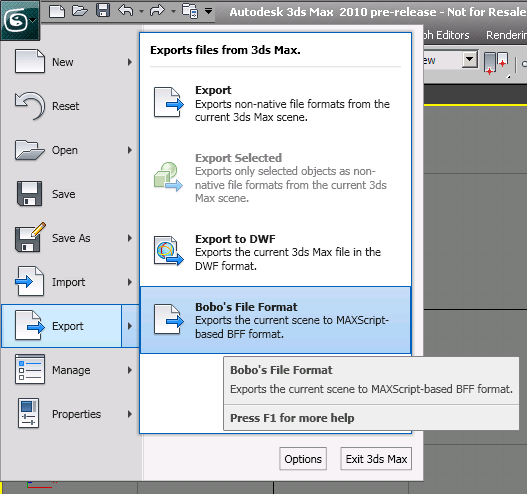 For example, to add a new option to the Application Menu > Export sub-menu to write the scene to the 3 rd party BFF file format, you could add the following to the \ui\ApplicationMenu.xaml file inside the definition starting with the header <ApplicationMenuItem Text="Export" IsSplit="true" Id="ExportSplit" ... |