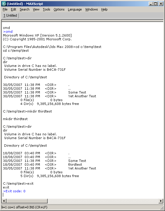 Some of the standard features of the Output pane can still be used in 3ds Max, for example typing in 'cmd' will launch a Windows Command Shell providing all DOS commands available in the stand-alone shell of MS Windows: