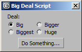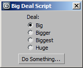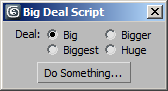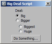 radiobuttons rad_buttons "Size:" labels:#("Big", "Bigger", "Biggest", "Huge") columns:2