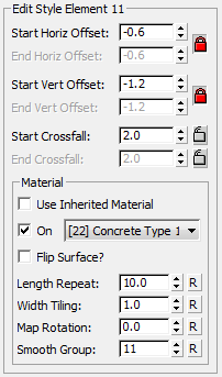 [lock Start/End Crossfall] Click to lock or unlock the Start and End values. When the Start Crossfall or End Crossfall value is locked, changing the Vertical Offset does not affect this value; otherwise, it does. Default = unlocked. Turning this on disables the other settings in the Material group, except for Smoothing Group.