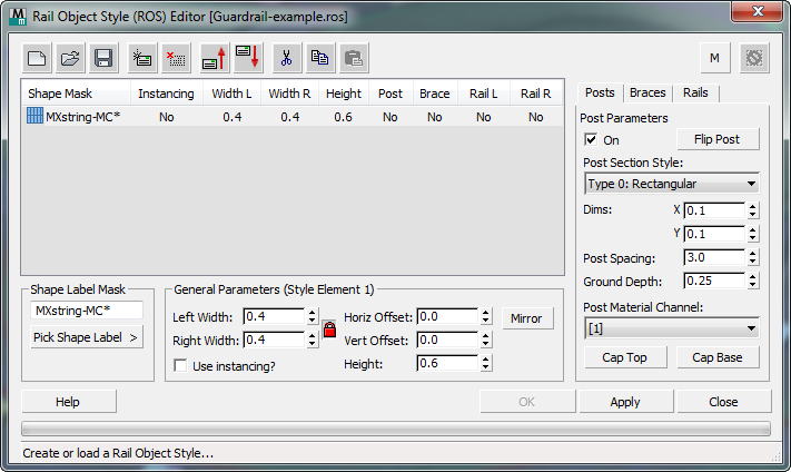 At the right of the editor is a panel for editing rail object styles. It consists of three tabs, one for each of the rail object components: Posts, Braces, and Rails.