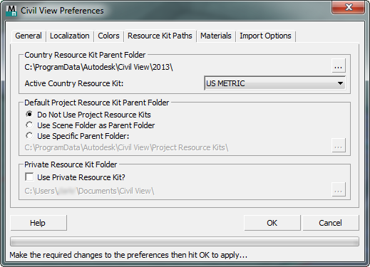 Can be activated from the Civil View Preferences panel. Holds personal resources that typically are used across a wider range of projects. The use of private resource kits opens the opportunity to apply security measures to country resource kits to avoid the accidental deletion or modification of shared resource-kit content.