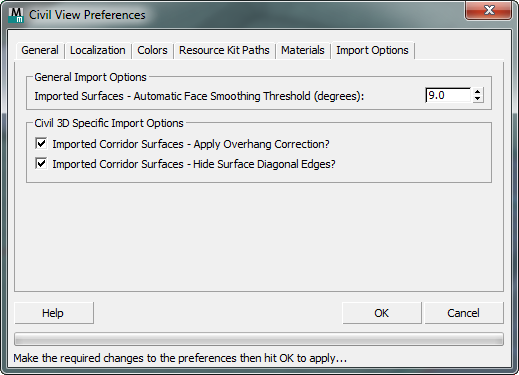 When on, causes all diagonal edges on imported corridor surfaces to be hidden. This improves viewport performance in 3ds Max and more closely resembles the way in which corridor surfaces are shown in AutoCAD Civil 3D. Rendered output is unaffected. Applicable to imported corridor geometry from AutoCAD Civil 3D only. Default=on.
