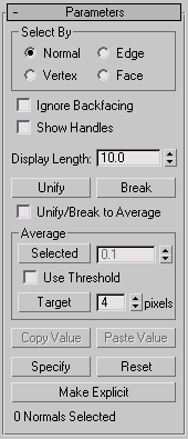 Sets selected normals to the same absolute angle: the average angle of all of them. If Use Threshold is on, averages only normals whose distance from each other is less than that specified in the Average Threshold spinner (to the button's right).