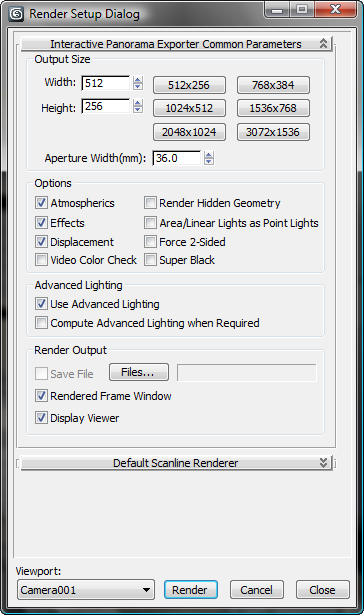 The Panorama Exporter Render Setup dialog is a modal version of the Render Setup dialog specially configured for generating panoramic output.