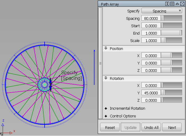 In the following image, a spoke (two surfaces, shown to the right of the bicycle wheel) is duplicated and placed along a circular path curve (inner rim). The operation is repeated twice to create two sets of spokes: one rotated by 45 degrees around Y (in pink), and the other rotated by 315 degrees around Y (in green).