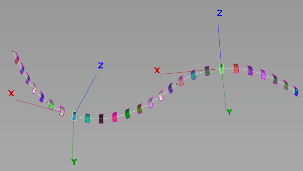Tangent – The first copy of the object takes the original orientation and all subsequent copies are rotated based on the tangent of the input curve at the point where the object is being placed. This allows the arrayed objects to follow the flow of the input curve.