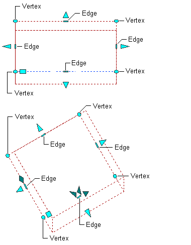 The types of editing grips available for a selected slab or roof slab depend on the view direction. As shown in the following illustrations, Edge, Edge Overhang, Vertex, and Pivot Point grips are displayed in both plan and three-dimensional (3D) isometric views. Angle, Vertical Offset, Horizontal Offset, and Thickness grips are available only in 3D isometric views.