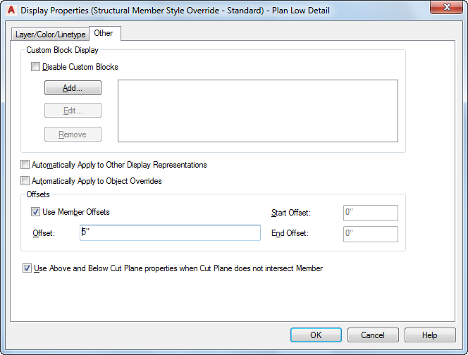 The Plan Low Detail display representation displays the member with simple lines and arcs. You can use this display representation to create a top view framing plan where you want a single line representation of a column. The Plan Low Detail display representation includes two display components, Beam Sketch and Brace Sketch. You can change the display properties of these components, such as layer, color, and linetype, to differentiate the display of beams and braces. On the Other tab of the style override dialog box for this display representation, you can also add offsets between members to display them as you typically would in a top view framing plan. Note that the Use Member Offsets check box applies only to the start and end offsets. The Offset value below the check box applies only to structural braces, and allows you to offset them horizontally so that they are visible even when positioned directly underneath a beam.