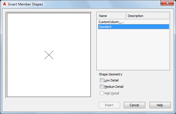 Use this procedure to insert one or more of the geometries defined for a custom shape into a drawing. The geometry can then be edited or used as is to define one of the display representations for another custom member shape you are creating or editing.