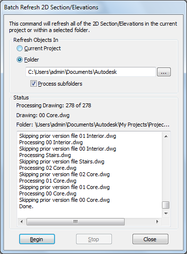 Note: When you are working with a large building project, updating all sections and elevations can be a time-consuming process. In this case, you might consider updating only a selected subfolder of your project and thereby improve system performance.